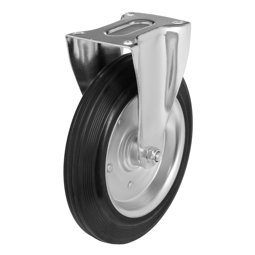 Колесо неповоротное 4002-250, диаметр 250мм., грузоподъемность 210кг. Колеса из черной литой резины, центр из двух гальванизированных дисков из штампованной стали. Роликовый (игольчатый) подшипник расположен в углублении, выдавленном под прессом, и содержит цилиндрические ролики подшипника. Неповоротный кронштейн изготовлен прессованием из листовой стали. Возможно применение на относительно грубых полах складов, заводов, производственных и строительных площадках. Данные колеса можно использовать на неровных поверхностях, во влажной окружающей среде и использовании вне помещения, не рекомендуется применять в среде с органическими растворителями, хлорированными веществами, гидрокарбонатами и минеральными маслами. Температура эксплуатации от -20 до +70С.