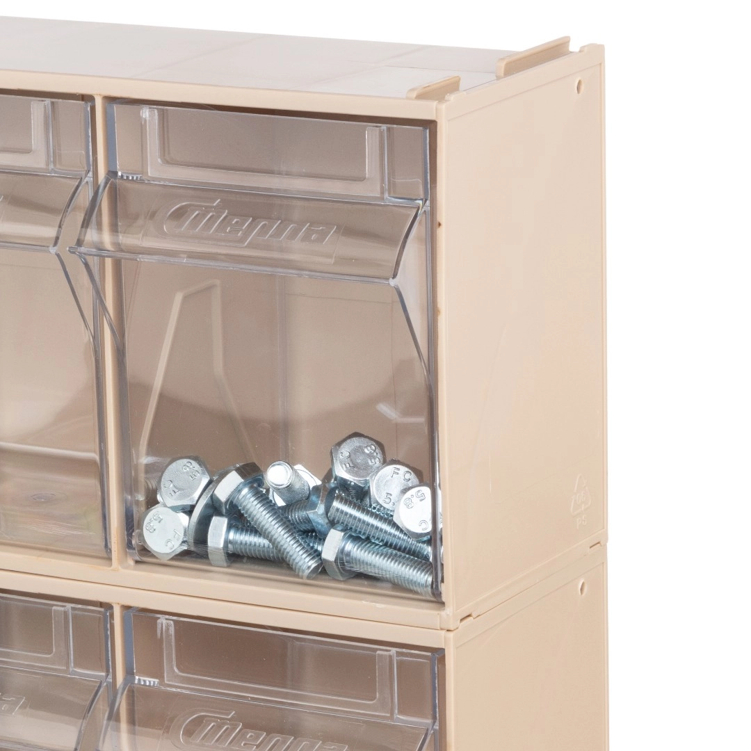 Короб откидной F-600-9-B, 600х68х78 мм 9 ячеек, бежевый / прозрачный служит для хранения мелкоштучных предметов. Данная система хранения не подвержена случайному опрокидыванию. Откидные ячейки обеспечивают быстрый доступ к необходимым предметам. В случае необходимости полного высыпания или наполнения короб легко извлекается. Полезный внутренний размер каждой ячейки 50х43х47мм.