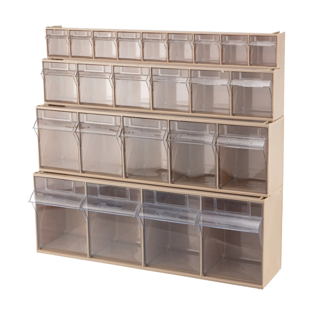 Специальный пластик, из которого выполнен короб, выдерживает значительные нагрузки и обладает оптимальной эластичностью. На основе данных коробов можно сформировать многоярусную систему хранения в том числе и с коробами большего размера.