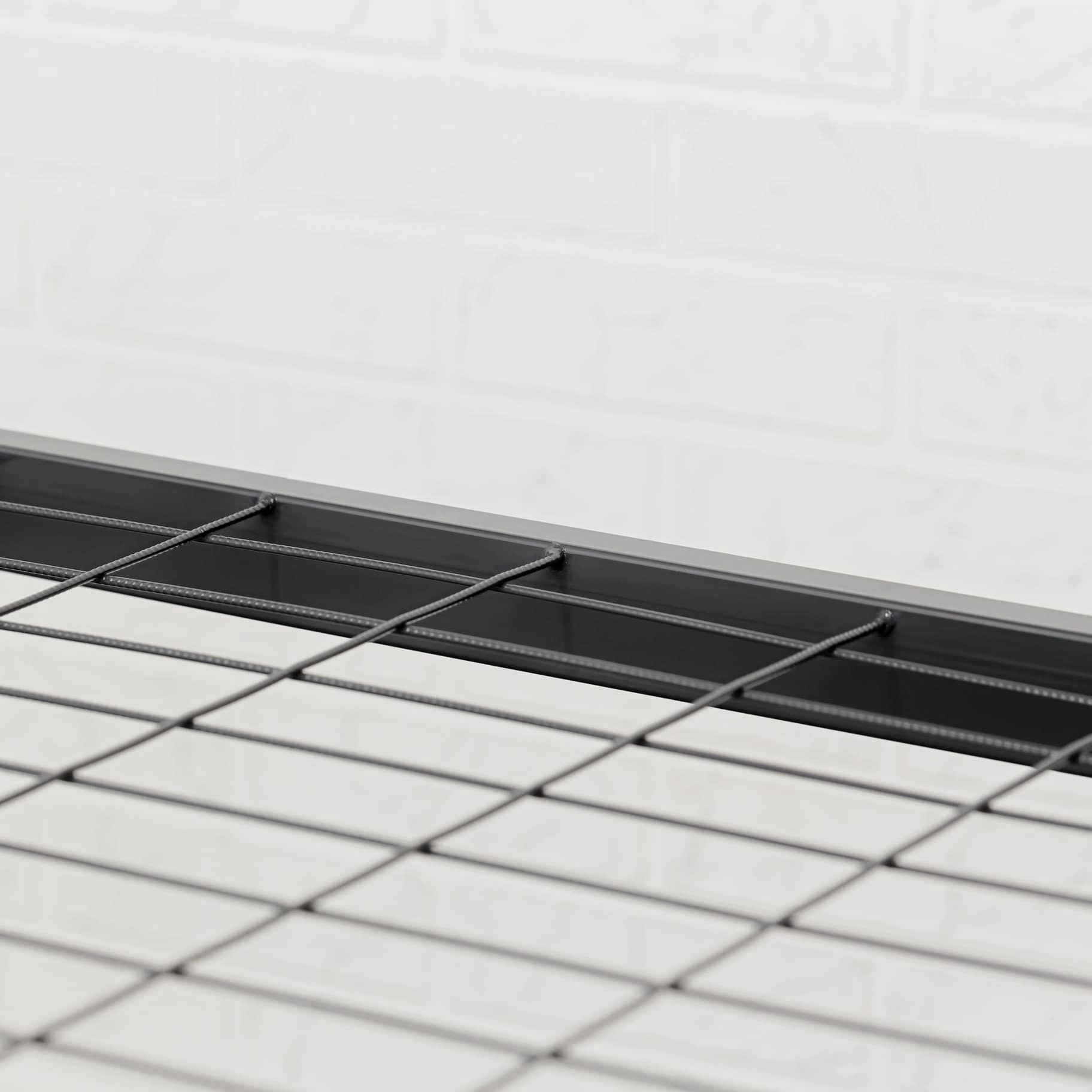 Кровать разборная из двух боковых стоек и спального места, крепящихся меж собой соединением «клин-петля»., обеспечивая надежное и просто соединение. На выбор клиента соединение можно заменить на болтовое. Вся кровать изготовлена из профильной трубы 40х20, сетка с ячейкой 100х50 мм. Все элементы кровати покрыты износоустойчивой полимерно - порошковой краской сероватого цвета. Допускаемая нагрузка на спальное пространство до 120 кг.