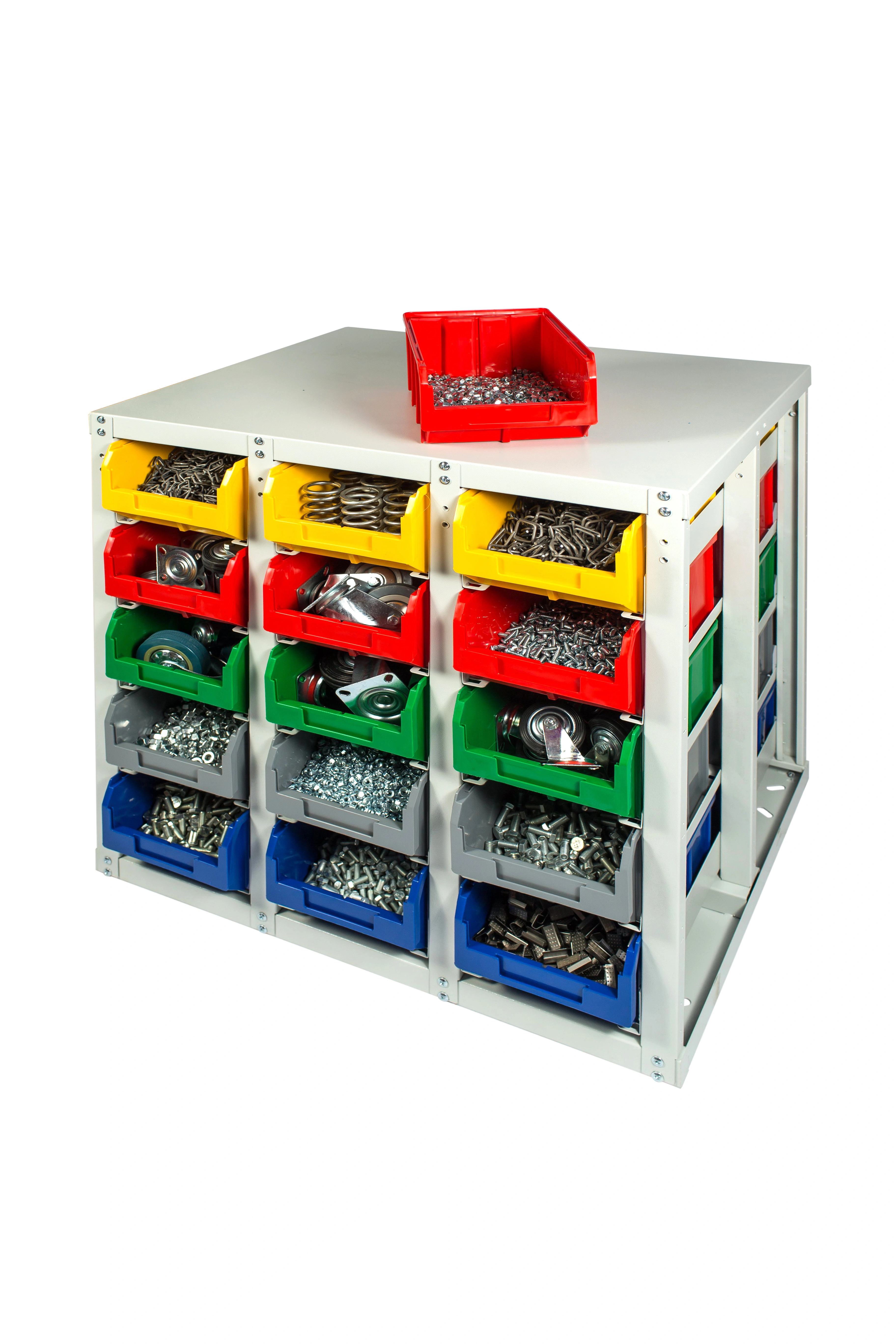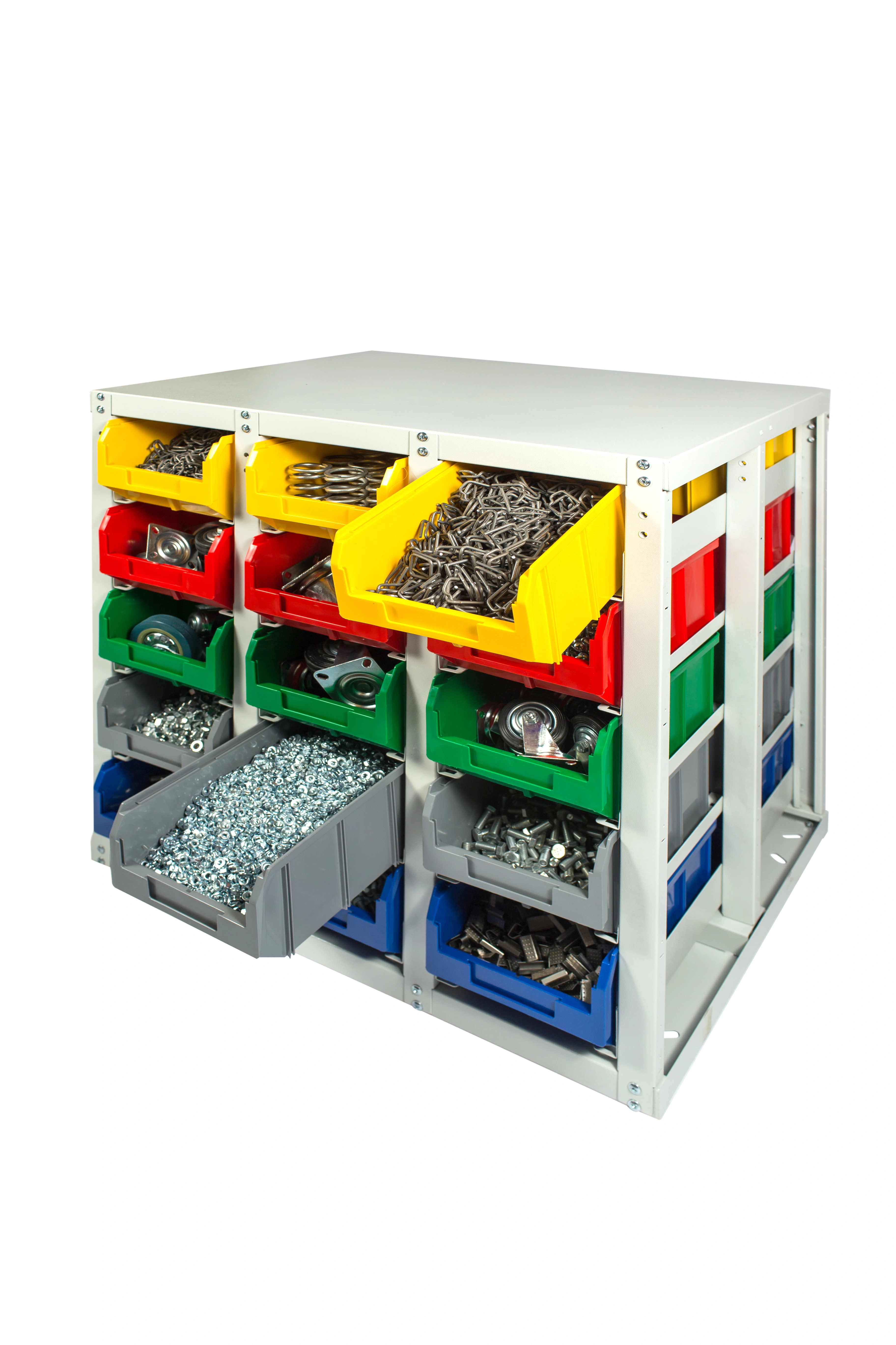 Данная конструкция предусматривает верхнюю полку, которую можно использовать как рабочую поверхность, например, для взвешивания и комплектации метизов или хранимых мелкоштучных изделий, подписи документов