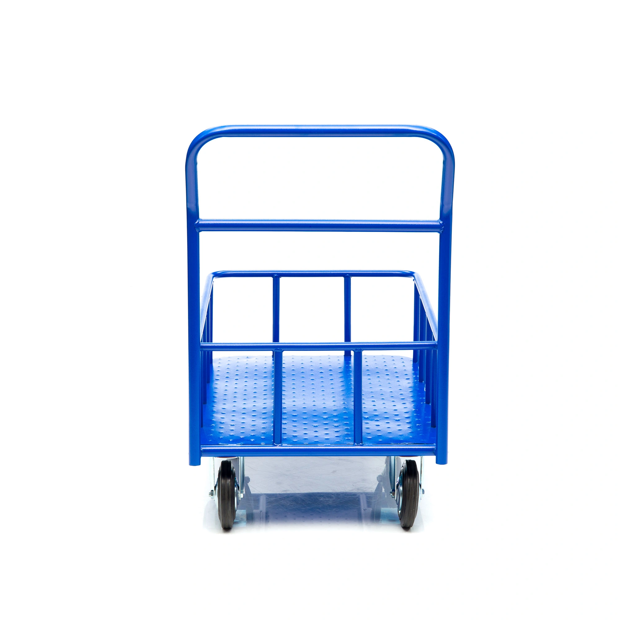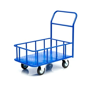 Платформенная 4-х колесная тележка КПБ-300-125-И (с бортом) используется для перемещения различных грузов, как в промышленности, так и в условиях склада или вокзала. Конструкция тележки цельносварная. Размер платформы 600х900мм., высота борта 150мм., высота ручки 750мм., Платформа имеет уникальную рельефную полимерную противоскользящую поверхность. Цвет - синий, шагрень. Малые габариты, удобная ручка и поворотные колеса обеспечивают высокую мобильность средства, 4 точки опоры гарантируют устойчивость тележки, а наличие невысоких бортов гарантирует безопасность перевозимого хрупкого и мелкоштучного груза. Тележка комплектуется: метизами для крепления, двумя поворотными и двумя неповоротными промышленными колесами, диаметром 150мм., из черной стандартной резины, от всемирно известного, ведущего итальянского производителя Tellure Rota. Грузоподъемность до 450кг.